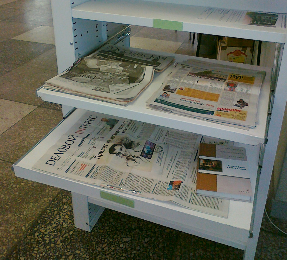 Читальный зал библиотеки. На нижних полках стеллажа выложены журналы. В средней части находятся выдвижные полки с передним бортиком для размещения подшивок газет. Выше перед обычной стационарной полкой установлена планка – карман для периодики.