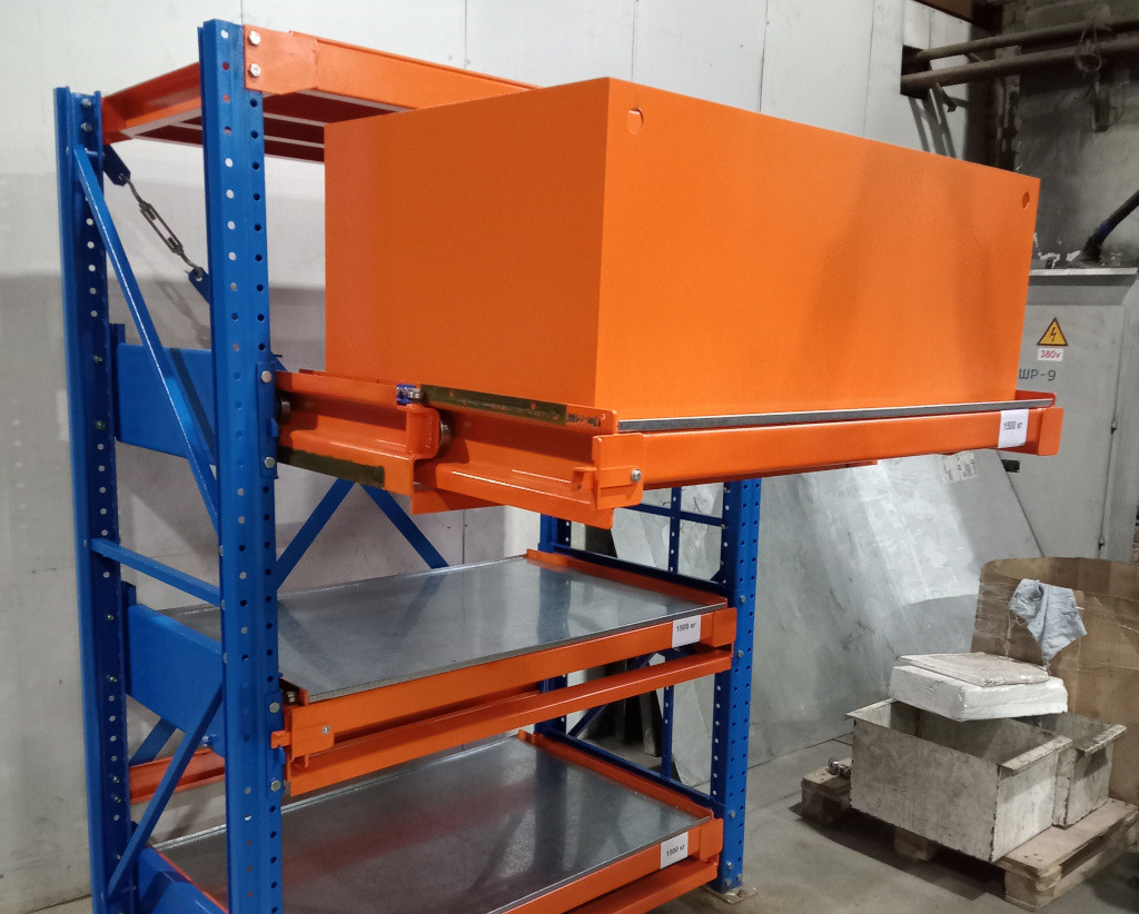 Стеллаж с полками полного выдвижения для хранения тяжёлых металлических ящиков, контейнеров с литьём и поковками. Механизм защиты от одновременного выдвижения нескольких платформ для безопасности. Электропривод полок для цехов с высокими требованиями к эргономике и скорости доступа к грузам.