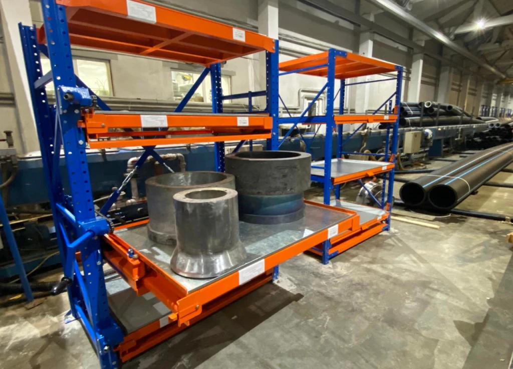 Металлические стеллажи с усиленной мобильной базой для хранения грузов общим весом до 350 кг на полку.