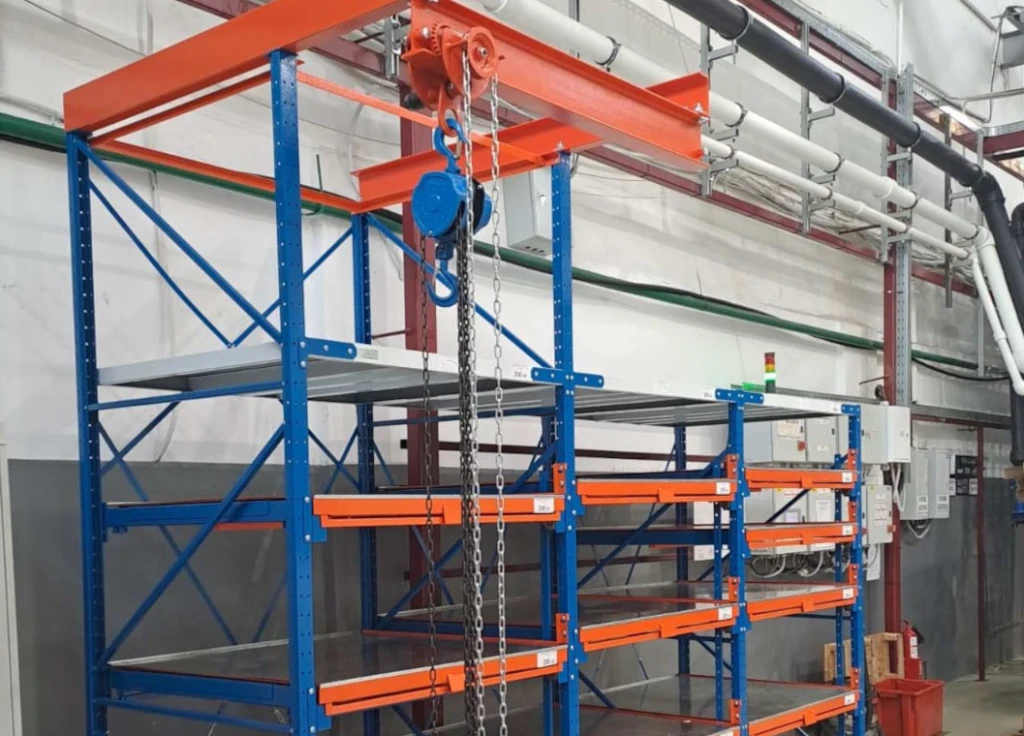 Стеллажи для тяжелых грузов весом до 1000 кг с полками частичного выдвижения и механизмом безопасности от одновременного выдвижения. Для облегчения работы могут комплектоваться талью.