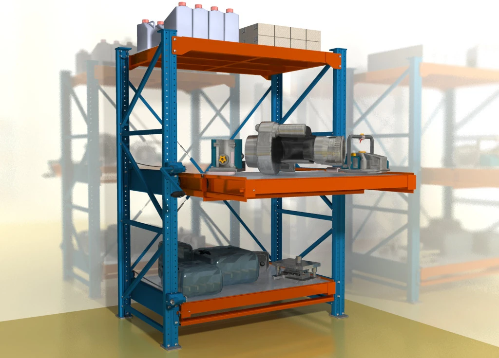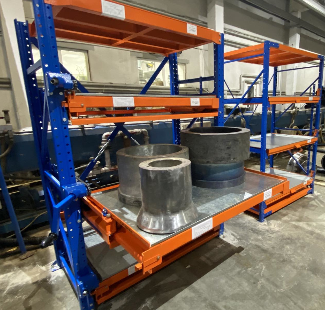 Производим стеллажи с выкатными платформами для хранения пресс-форм, штампов, тяжелых или крупногабаритных деталей, сборочных узлов и заготовок, отливок, изложниц и различных видов промышленной оснастки. Удобство и безопасность работы с подъемными механизмами сочетаются с экономией площадей. Металлические стеллажи с выдвижными полками для тяжелых грузов используются в промышленности, в цехах, производственных и складских помещениях.