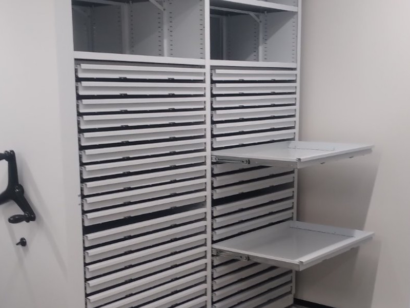 Стеллажи с выдвижными ящиками для чертежей, калек, карт или планов. Высота: от 50 мм до 300 мм. В секции стеллажа может разместиться до 40 ящиков. Отличный вариант для хранения подлинников, которые не рекомендуется складывать.